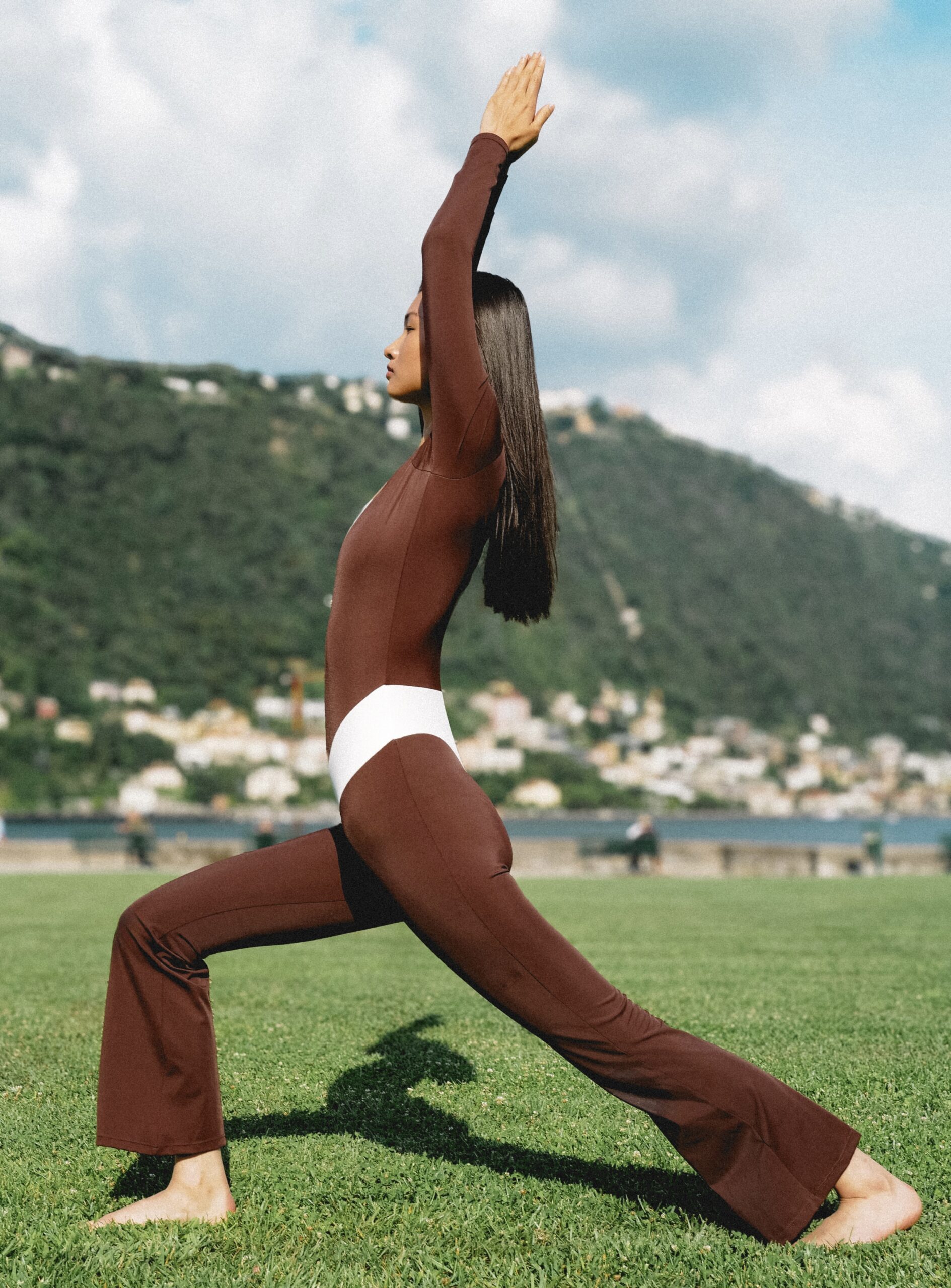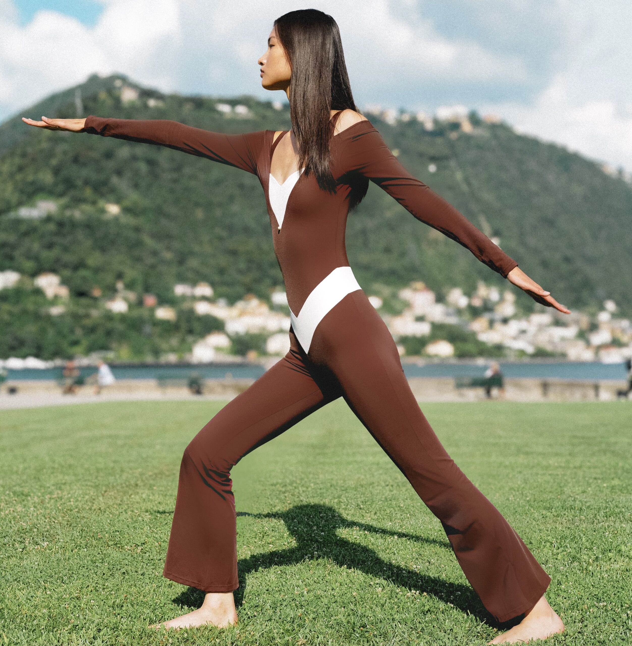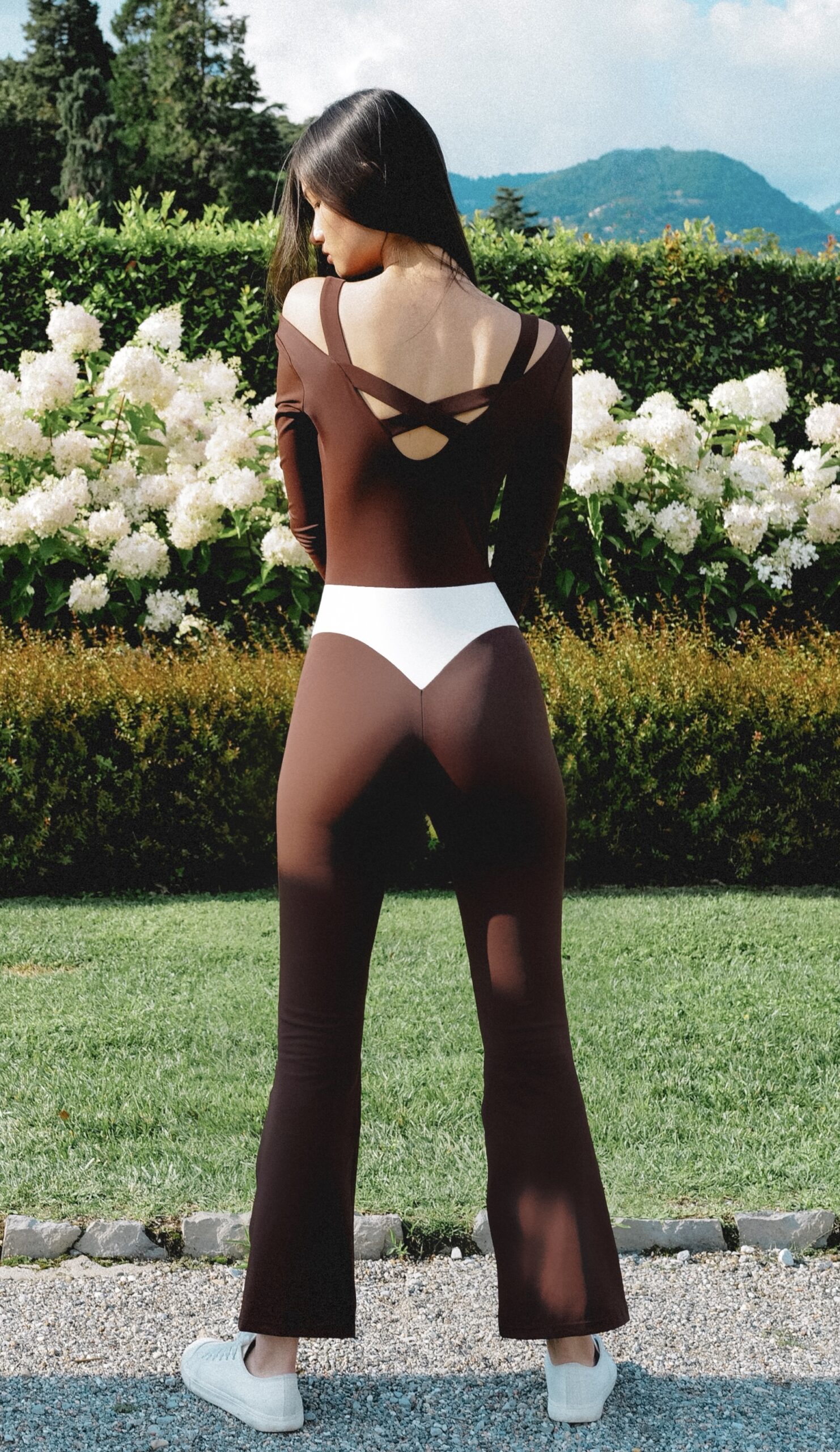 Ciocolatto is distinguished by its deep V-contour neckline and waistband, a sculptural design element that cinches the waist and elongates the figure. The long, sculpted sleeves add sophistication, while the cross-back straps reveal a touch of allure with every movement. Designed as a second-skin fit, Ciocolatto transitions effortlessly from the studio to Riviera evenings, redefining what it means to move in couture.