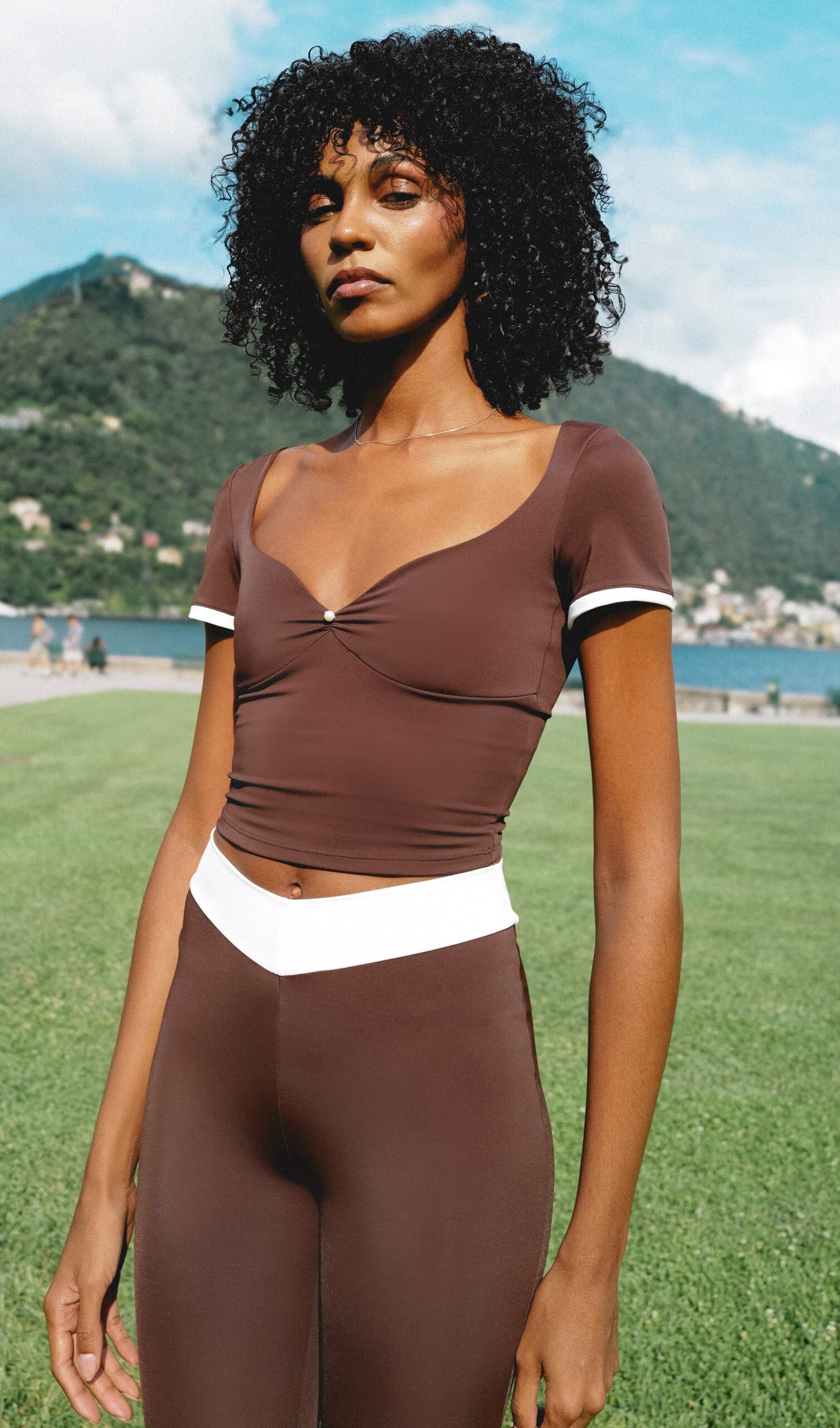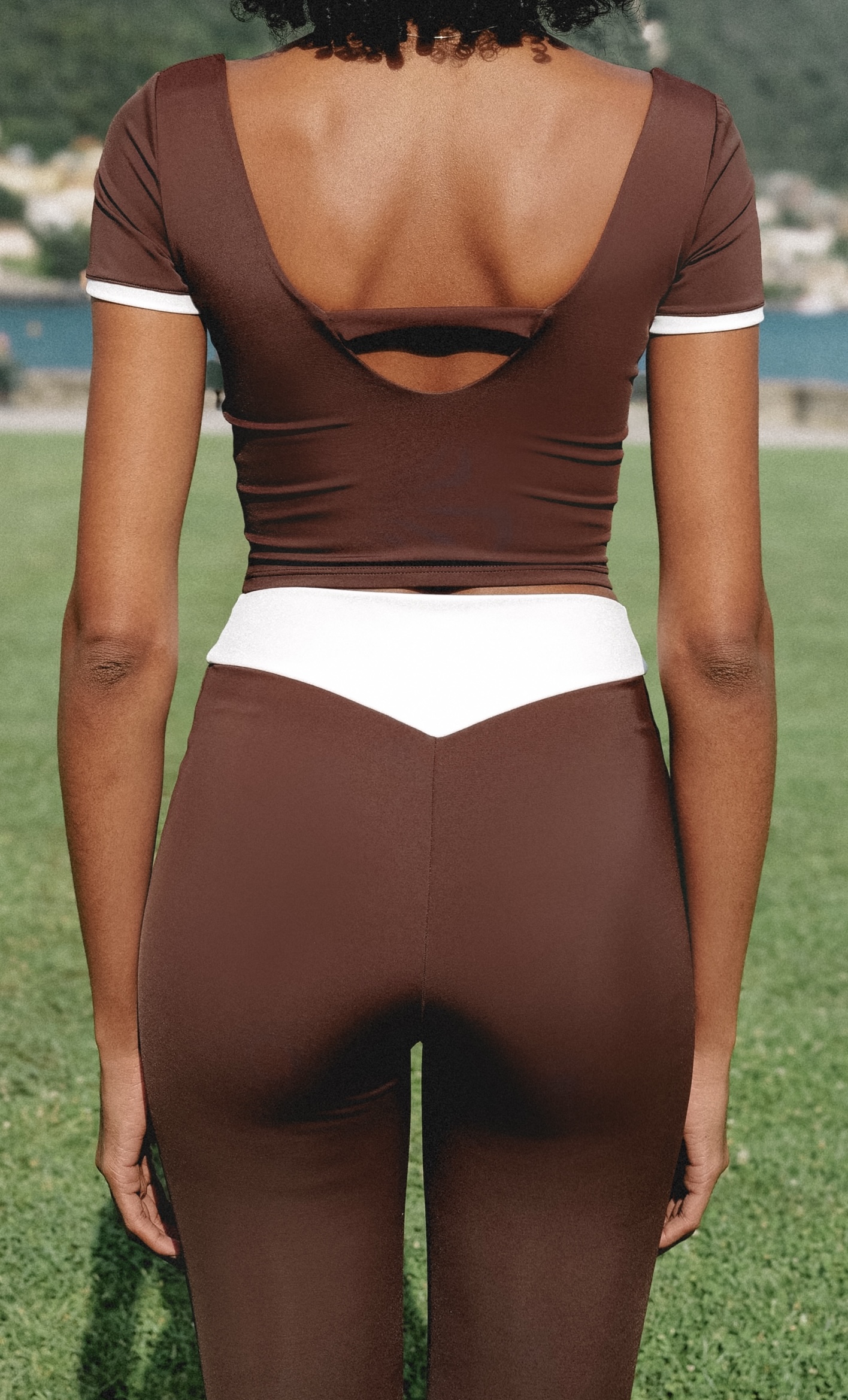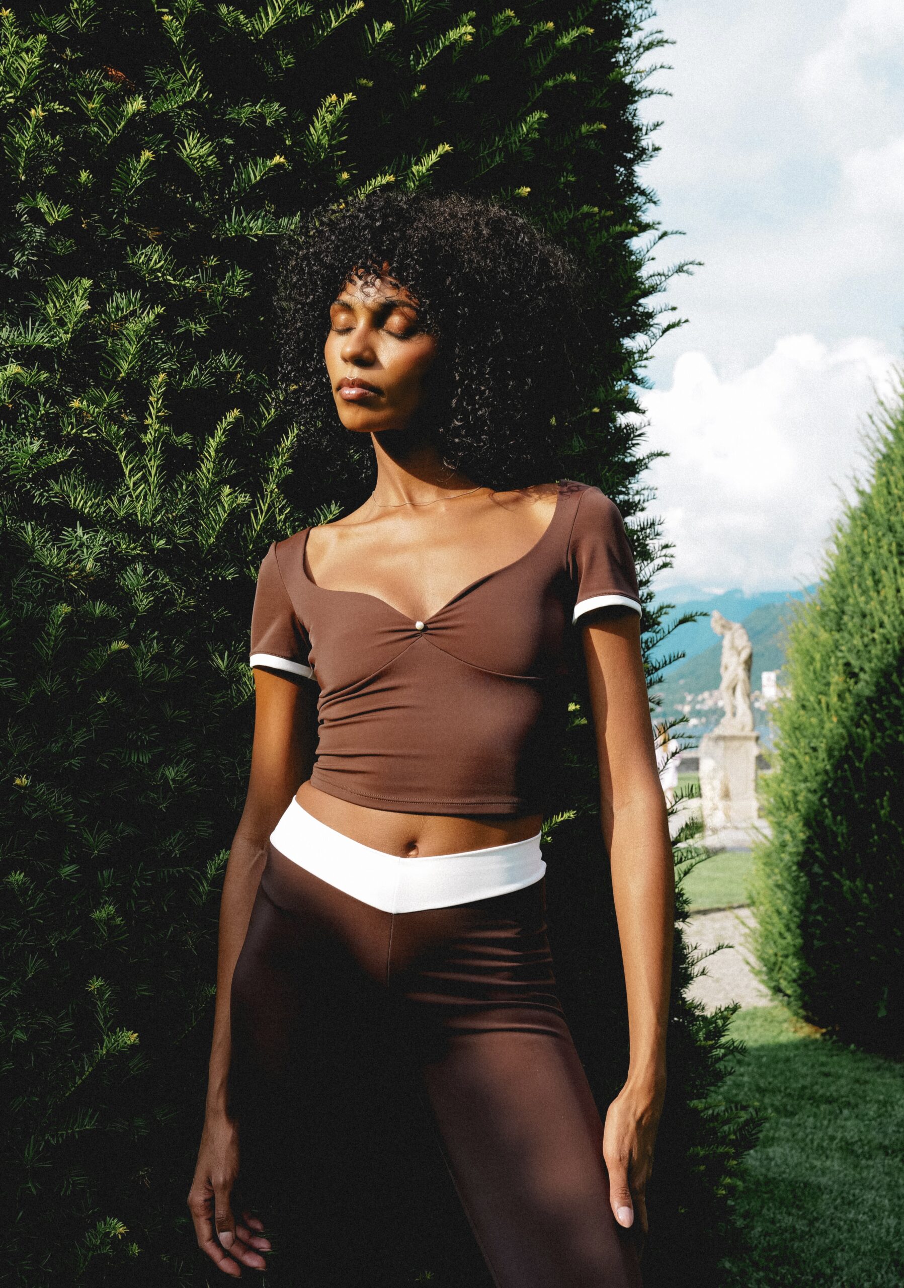 The Peonia Top features a refined sweetheart neckline adorned with a hand-applied natural pearl, a symbol of purity and rare beauty. Its sculpted short sleeves are finished with white couture piping, adding contrast and refinement to the silhouette. The open-back detail introduces an element of allure, balancing elegance with sensuality. Paired with the Peonia Leggings, designed with a signature V-contour waistband, the set sculpts, elongates, and defines the waistline, creating an effortless hourglass effect.